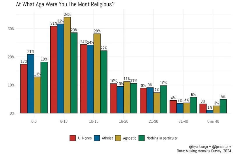 We asked the currently non-religious: At what age were you the most religious? Zero meant "I was never religious." 17% of nones chose that. The most popular age range? 6-10 years old. Followed by 10-15 years old.